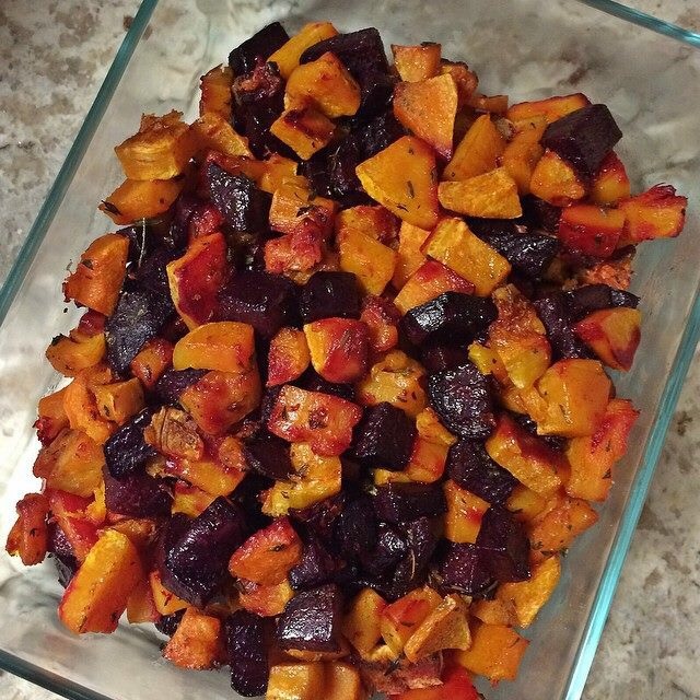 Preheat oven to 425. Combine sweet potatoes, beets, seasonings & olive oil. Toss to coat evenly. Place onto a foil covered baking sheet & roast for about 25 minutes unto the sweets & beets are soft. Finish with another sprinkle of sea salt if necessary!
