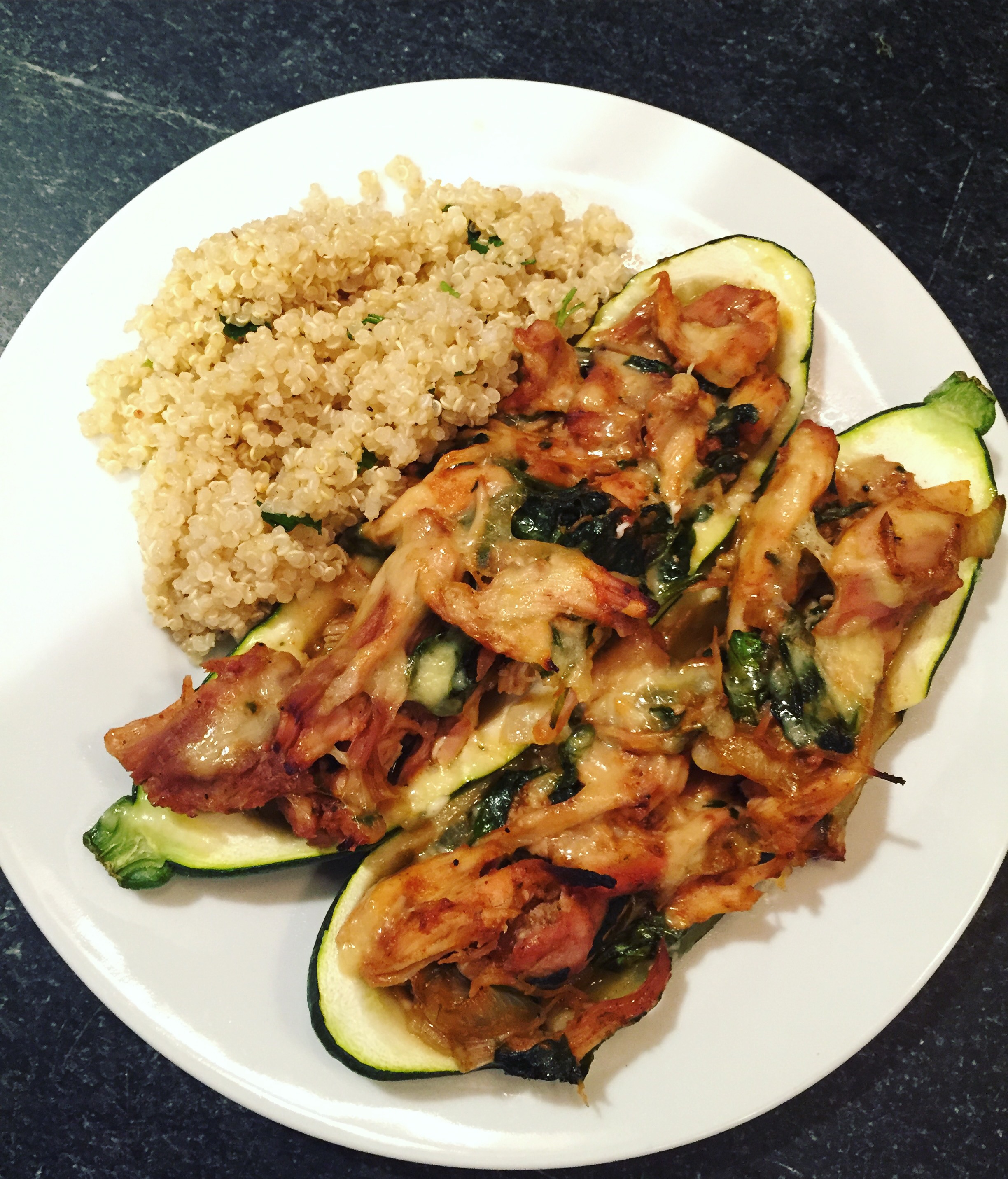 Fill the “wells” in the zucchini with chicken, onion and spinach mixture. Try to compact as much as possible and get them loaded up! Top with shredded cheese and bake for 45 minute until zucchini is soft & cheese is melted!